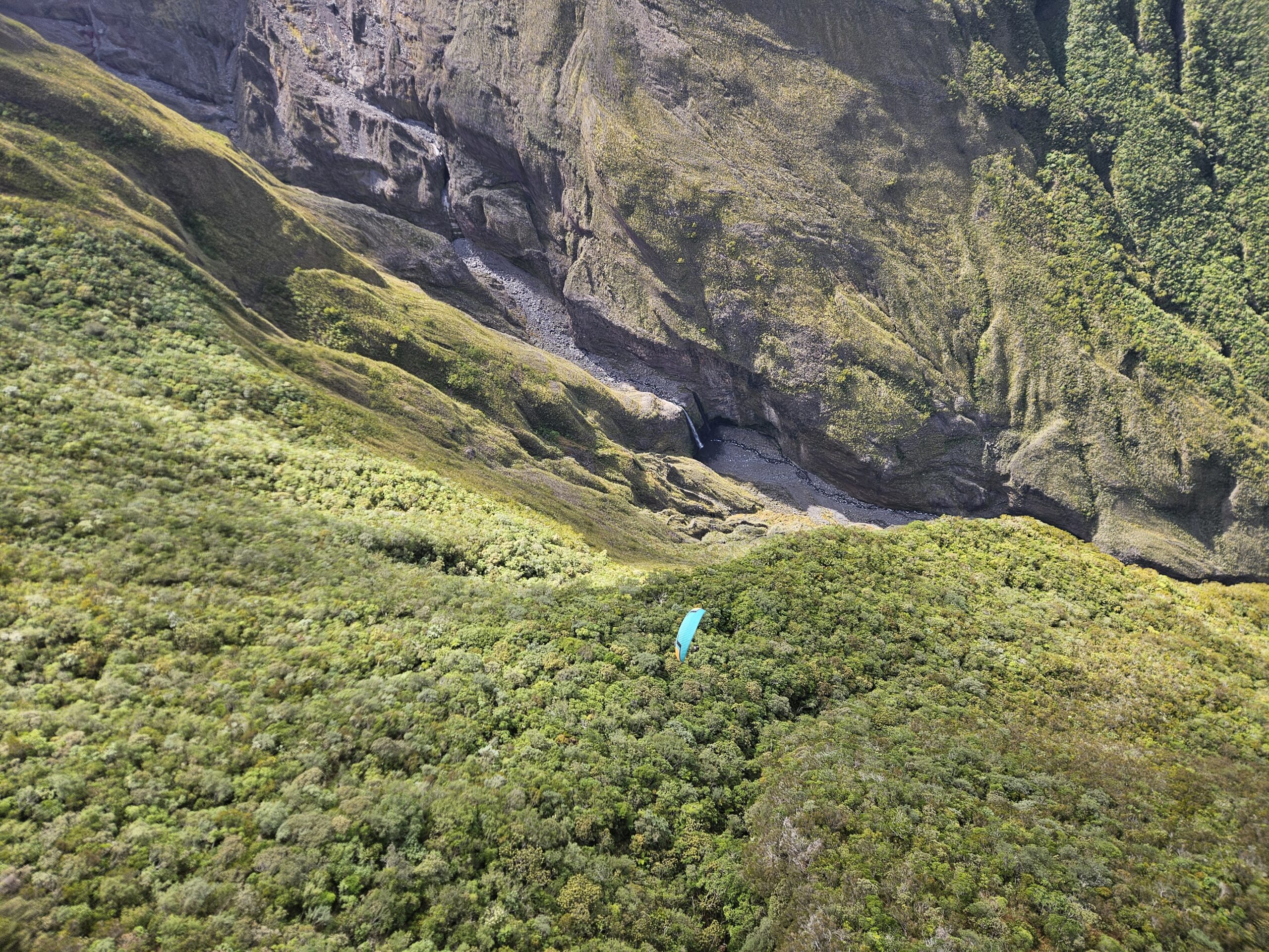 An mehreren Tagen gleiten wir bereits früh morgens über tiefe, von üppiger tropischer Vegetation bedeckte Canyons, vorbei an hohen Wasserfällen, bis zum Landeplatz am Meer. Schon ab 8 Uhr morgens kann uns die Thermik entlang steiler Flanken über den Dschungel tragen.